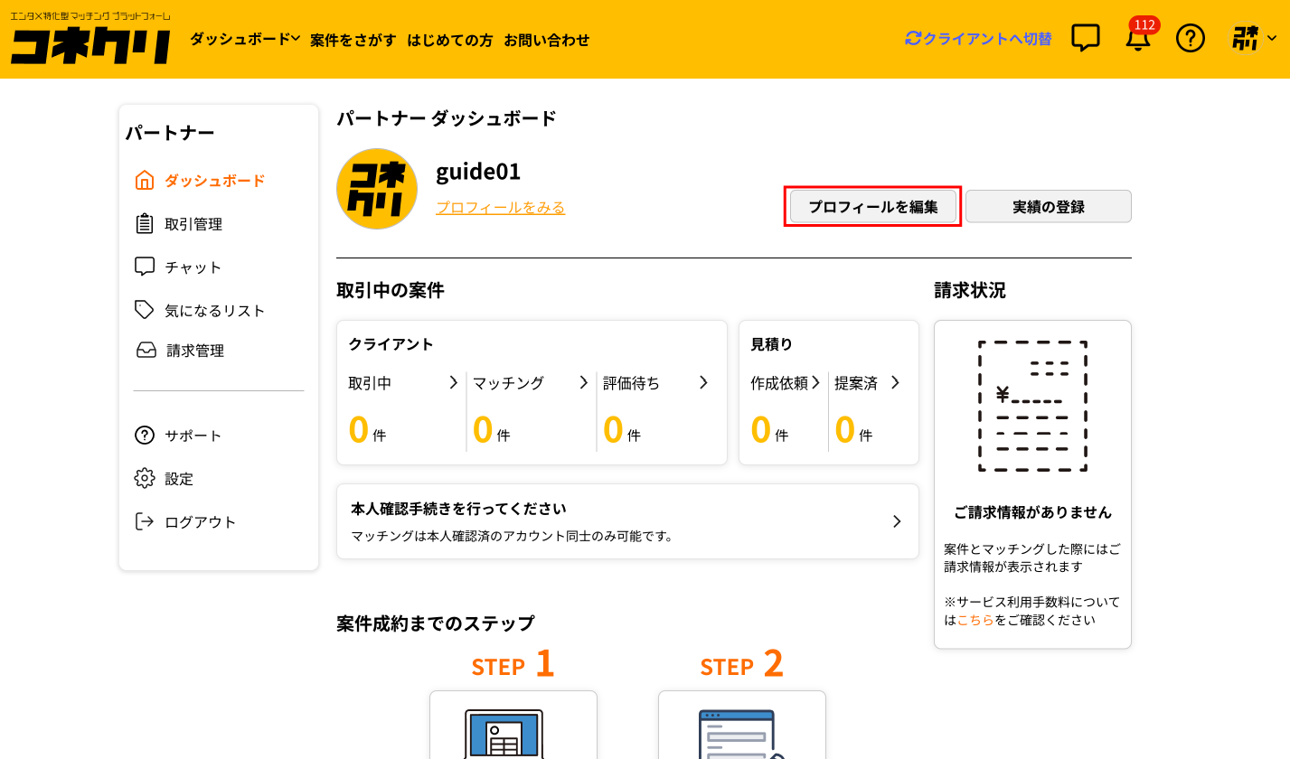 ※新規登録の際にプロフィールを登録された方は「STEP2 : 実績の登録」へお進みください