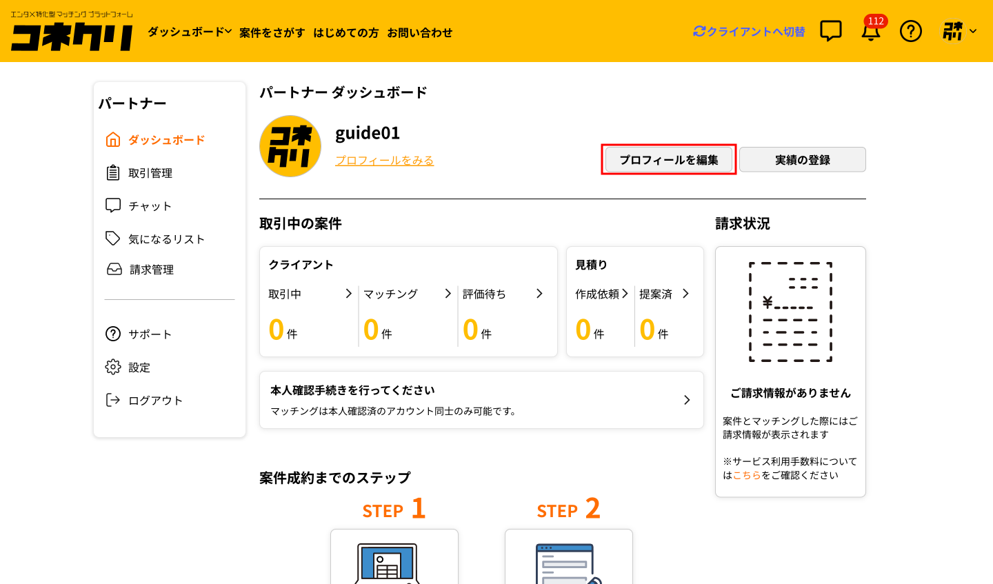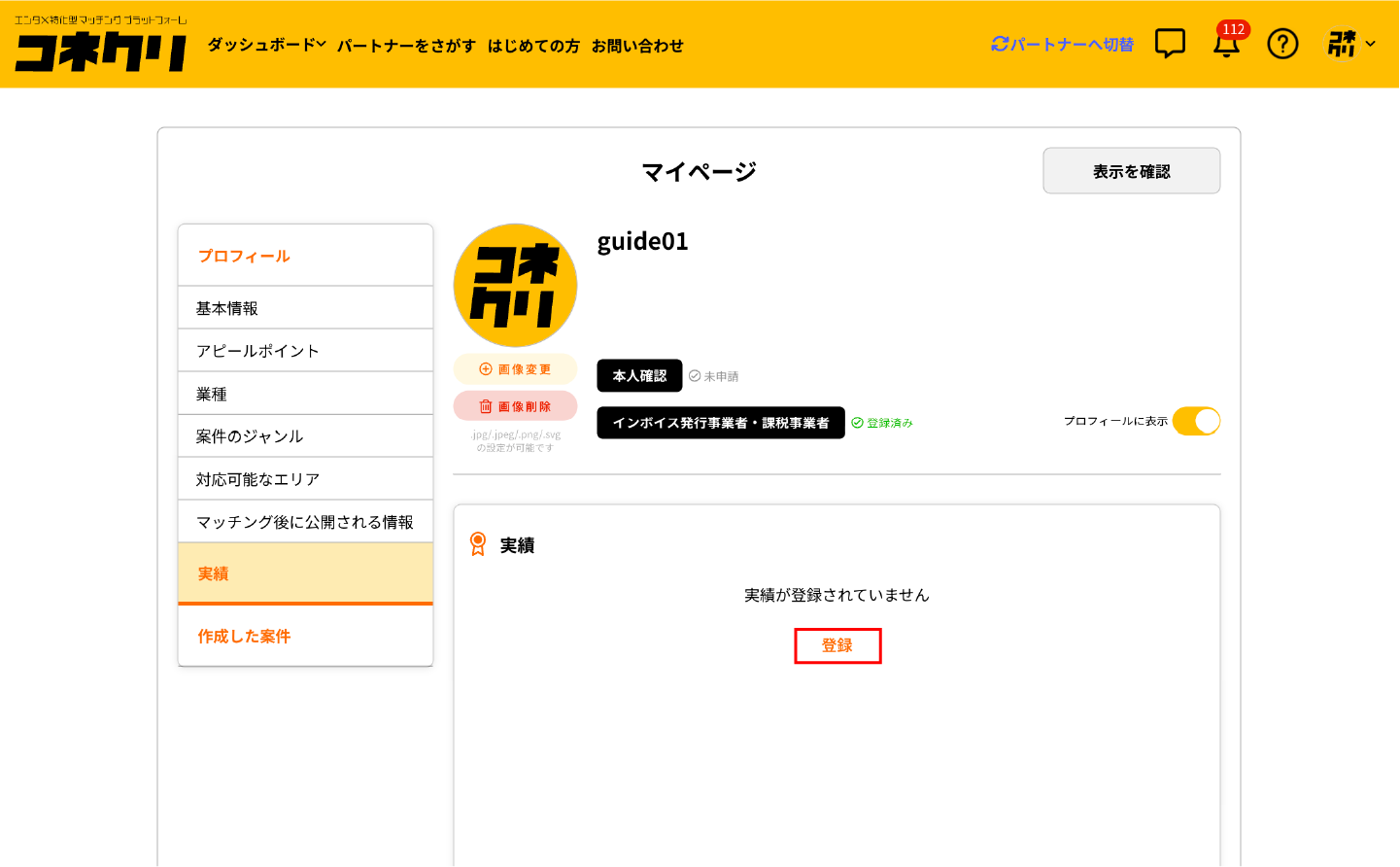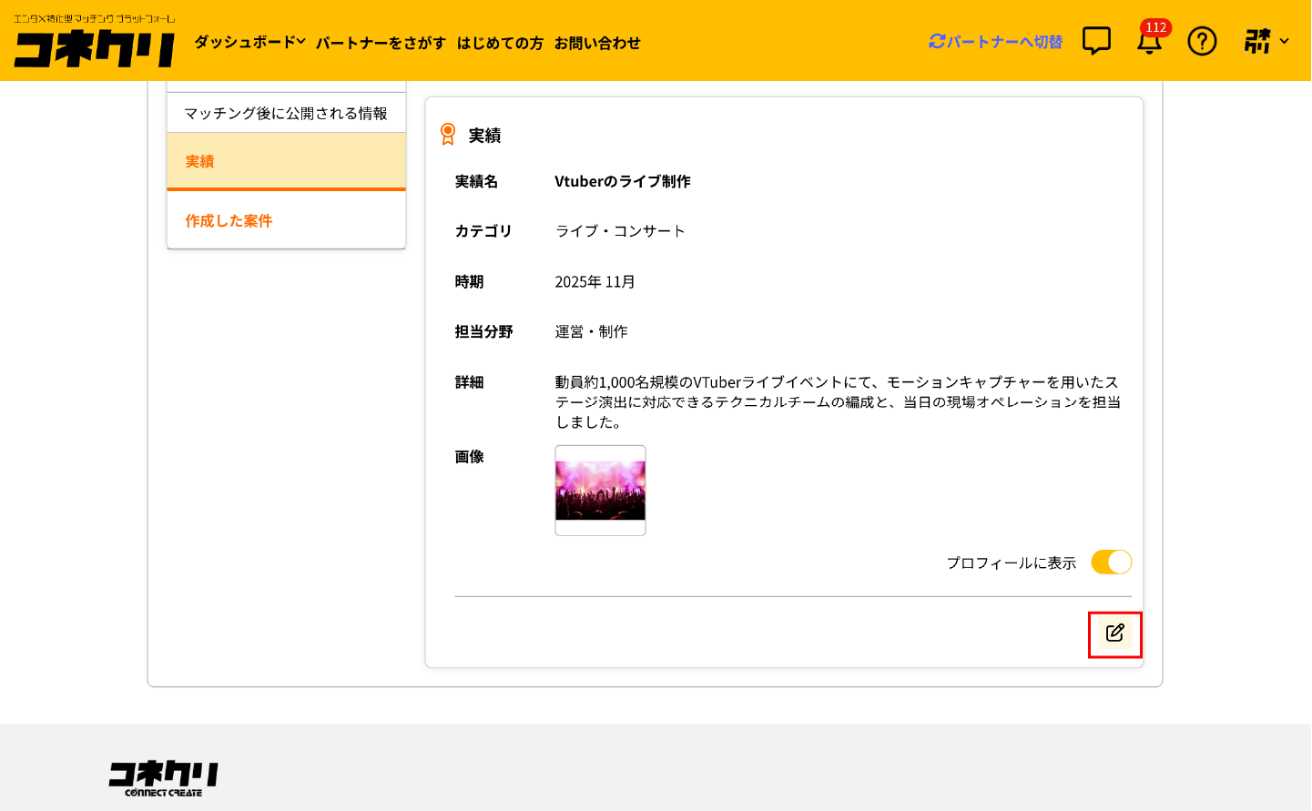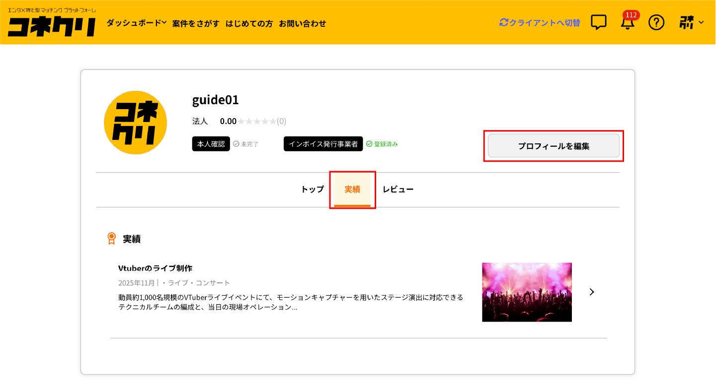 実績内容の修正・追加をしたい場合は「プロフィールを編集」からマイページに戻り、再度編集を行ってください。