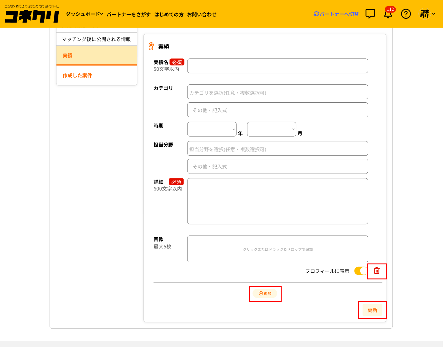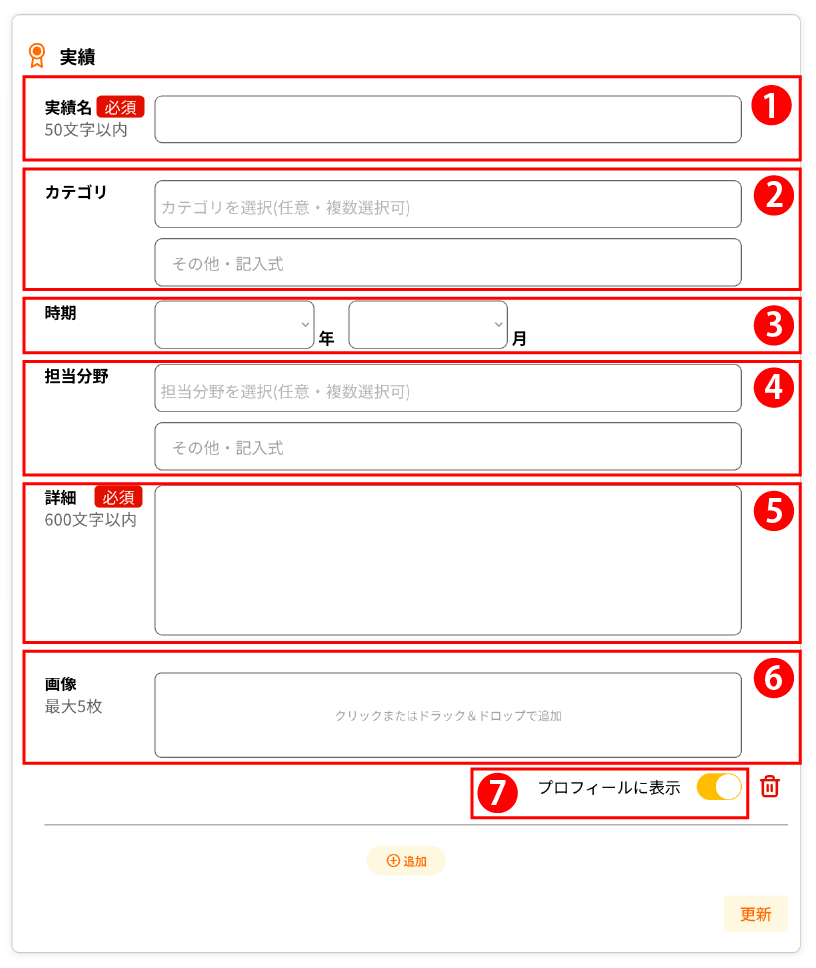 4.実績の追加は画面下部の「追加」、削除を行う場合は各実績入力欄 右下の「ゴミ箱」を選択